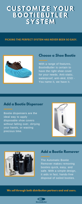 BootieButler’s Customizable Shoe Cover Systems is the faster, cleaner, and safer way to utilize shoe covers in your business. With everything from our very own shoe cover systems, to bootie dispensers and removers, to various booties, BootieButler has your organization covered. In our extremely unbiased opinion, there is simply no better system for high volume applications. With everything from our very own shoe cover systems, to bootie dispensers and removers, to various booties, BootieButler has the best safety shoe cover system in the business.